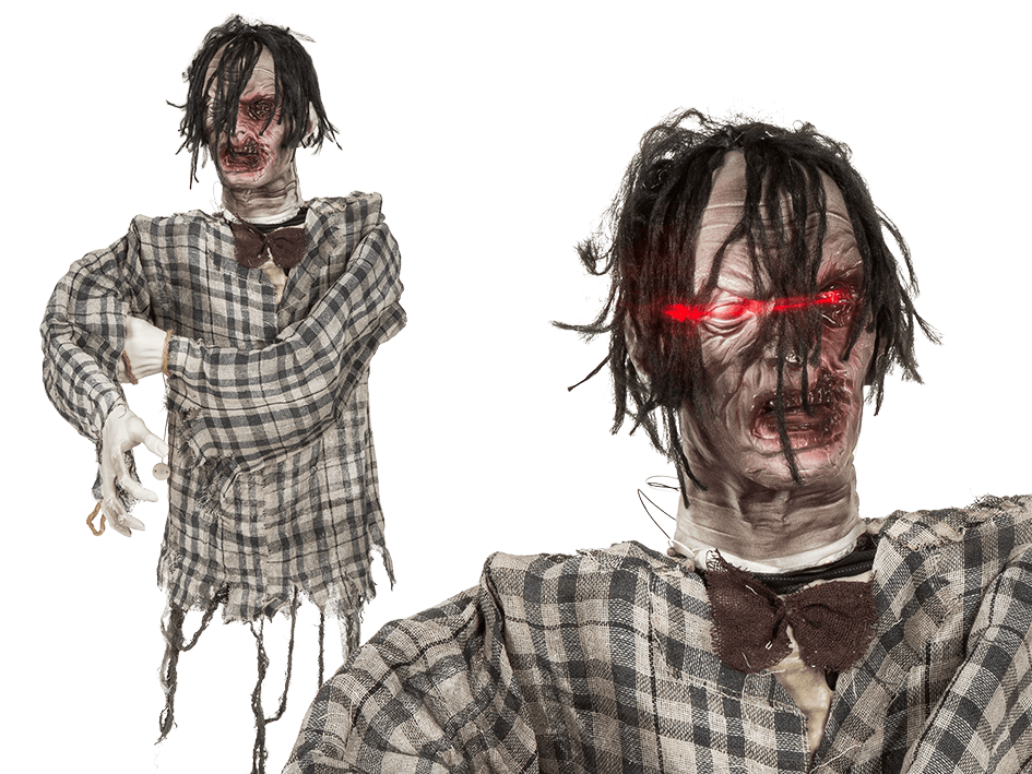 Hirttävä Zombie valolla sekä äänellä ja liikkeillä. Korkeus noin 143cm. Sisältää patterit. Huom, kiinnitys esim. kepin nokkaan, kädet ja pää liikkuu joten ei voi roikkua.... Lue lisää