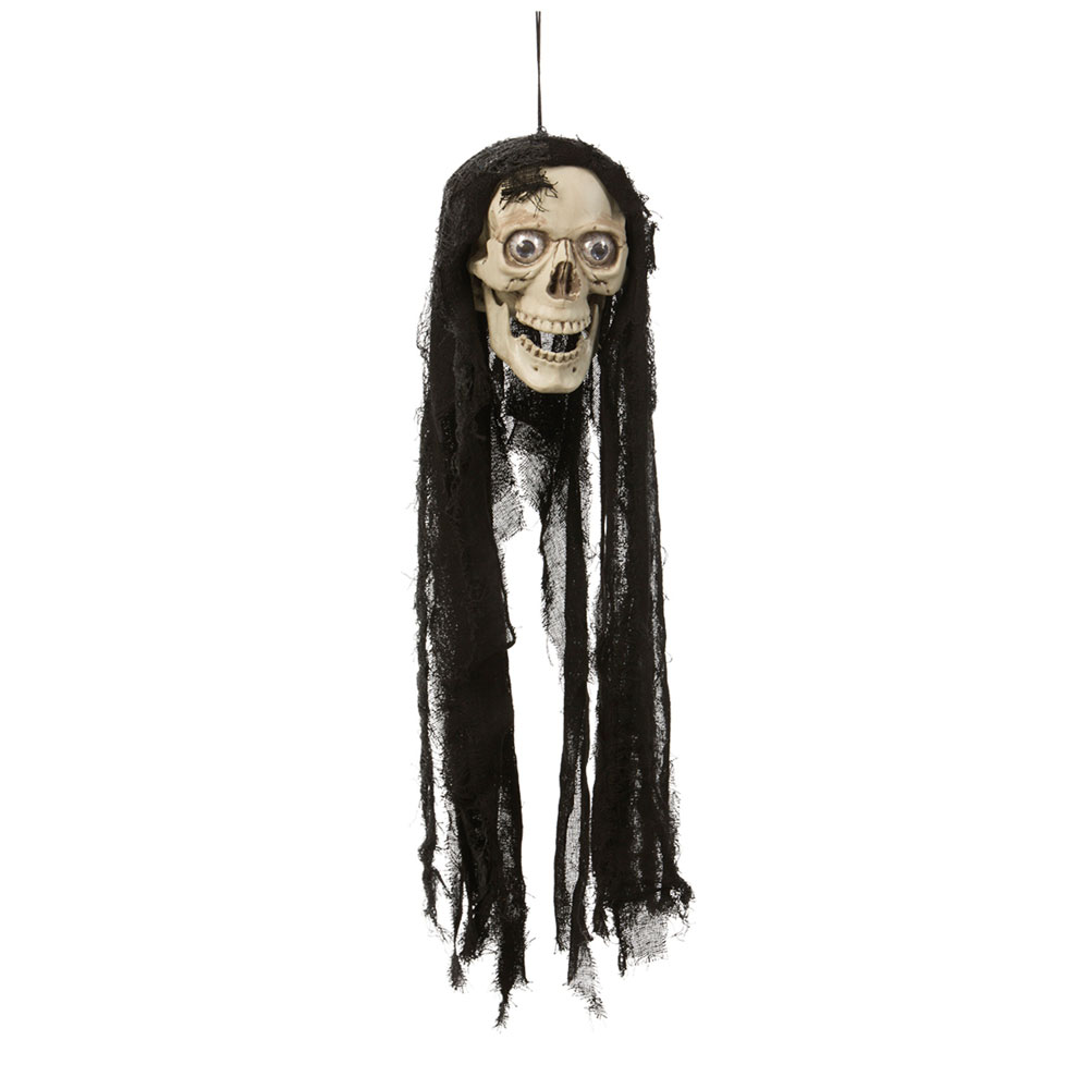 Pääkallo koristeeksi. Korkeus pääkallolla n.19cm. Kokonaiskorkeus n.68cm. Napista saa painettua silmät loistamaan ja pääkallon juttelemaan mukavia. 2.laatu. Osassa silmiä sivussa kuplia tai muita pieniä kosmeettisia juttuja.