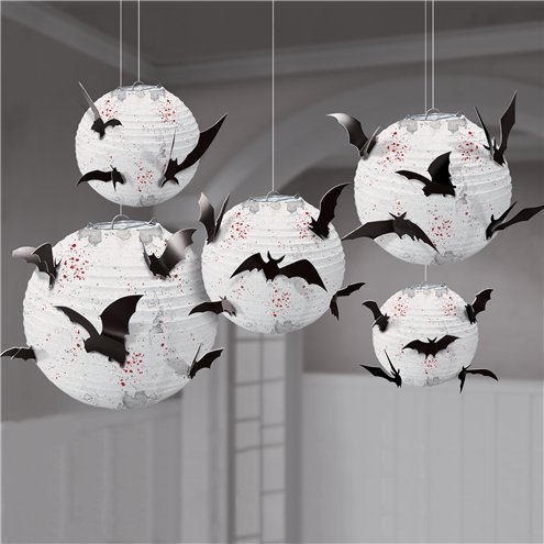 Paperilyhdyt lepakoilla. 1pc 24,7cm, 2pcs 19,6cm ja 2pcs 14,6cm. +24 lepakkoa.
