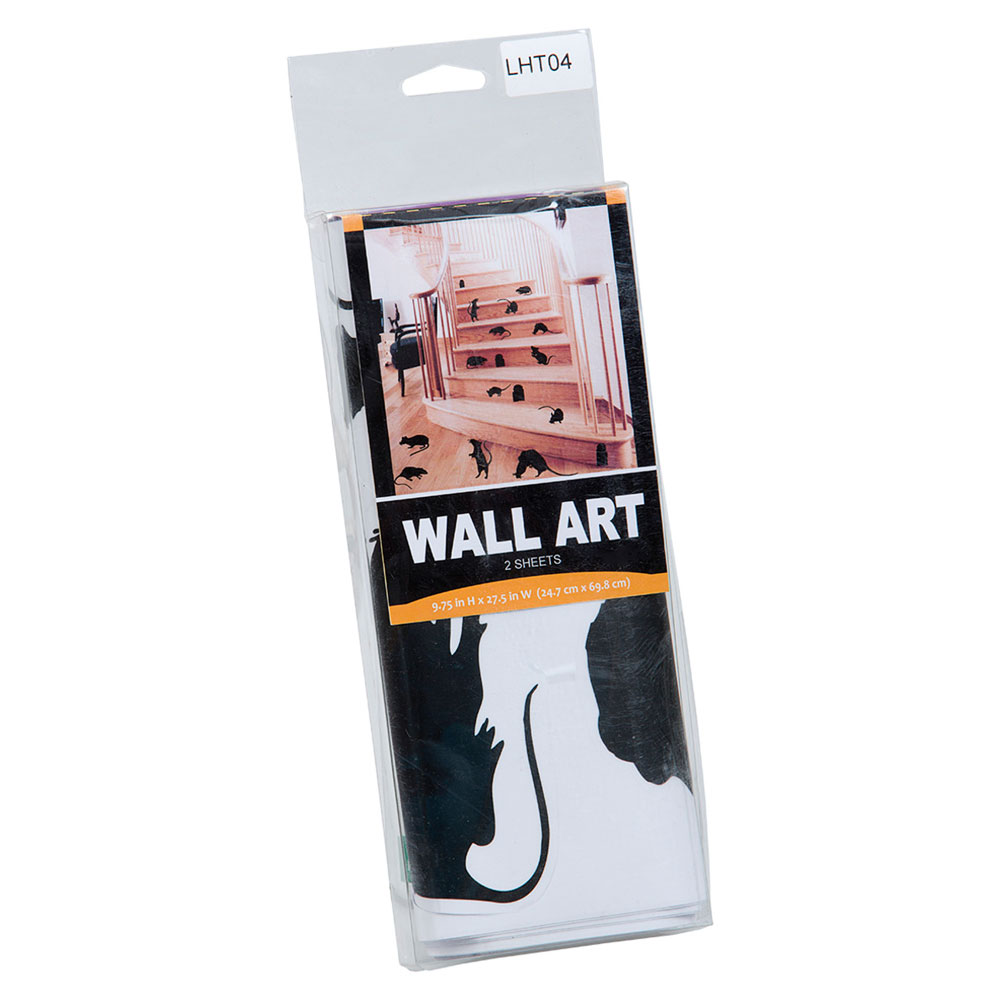 Rotta seinätarroja. Pakkaukseen kuuluu 12 rottaa ja 6 \"koloa\". Voi käyttää esim. seinän, portaan, oven jne.koristeluun.