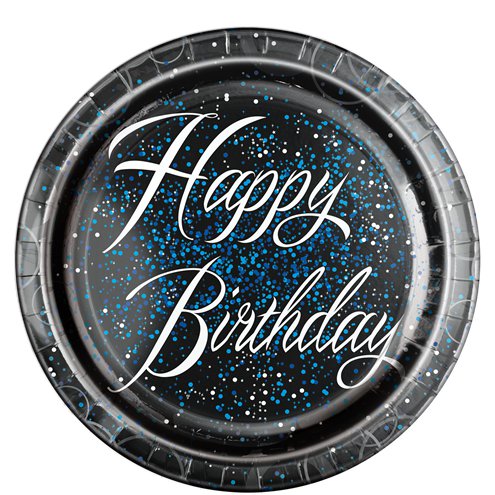 Musta, hopea ja sinisävytteinset Happy Birthday lautaset. ca.23cm. 8pack