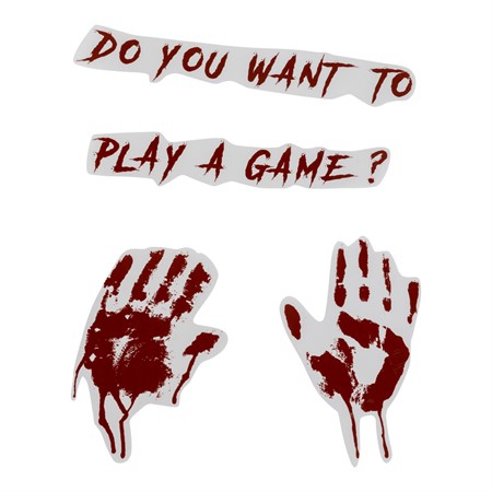 Halloween peilitarra "Do you want to play a game?" tekstillä ja verisillä kädenjäljillä. Kokomerkintä 42x30cm.