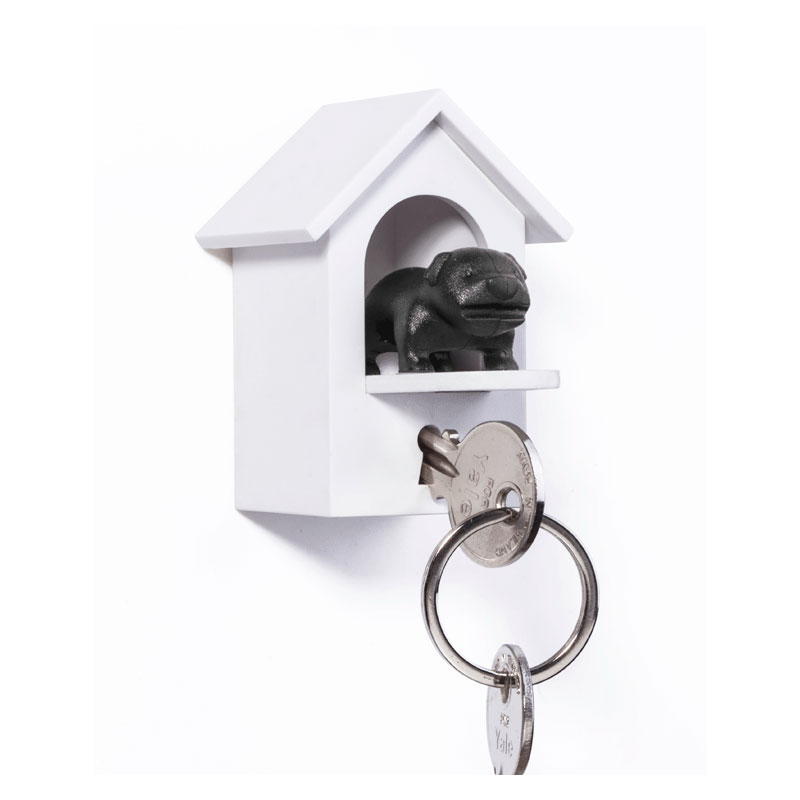 Valkoinen koto mustalla koiralla. Kun laitat avain avaimenperän koirakodon lukkoon, luukku aukeaa ja koira tulee esiin ja samalla avaimet pysyy tallessa. Kodon koko 7x4x5cm.