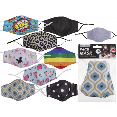 Valikoima erilaisia kangasmaskeja. Tuotteiden pesu 60 asteessa. Säädettävät kumilenksut korvien taakse.