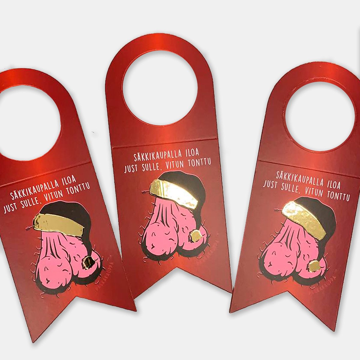 Tässäpä helppo ja edullinen vaihtoehto joulupullon koristeluun. Tukevasta kartongista valmistettu härpäke jouluisalla tervehdyksellä!