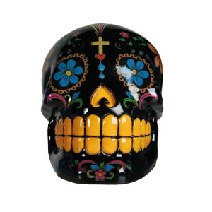 Musta koristeltu pääkallo, rahapankki ja koriste-esine.