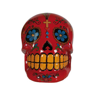 Punainen koristeltu pääkallo, rahapankki ja koriste-esine.