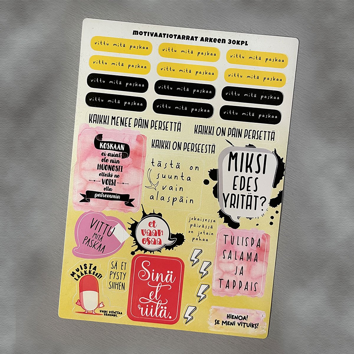 Motivaatiotarrat piristämään sun harmaata arkea. Aaviis (A5)-kokoinen arkki sisältää 30 tarraa, joilla voit tsempata itseäsi ja miksei toki muitakin.