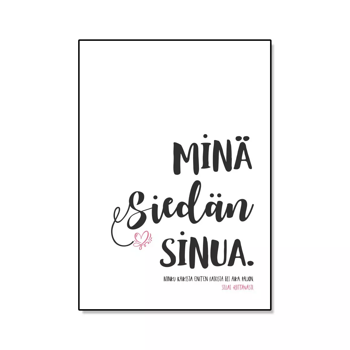 Siedin sinua eilen, saatanpa sietää jopa tänäänkin. Kaikista eniten kaikista eli aika paljon. Sillai riittävästi. Koko: A6 (105mm X 148mm)