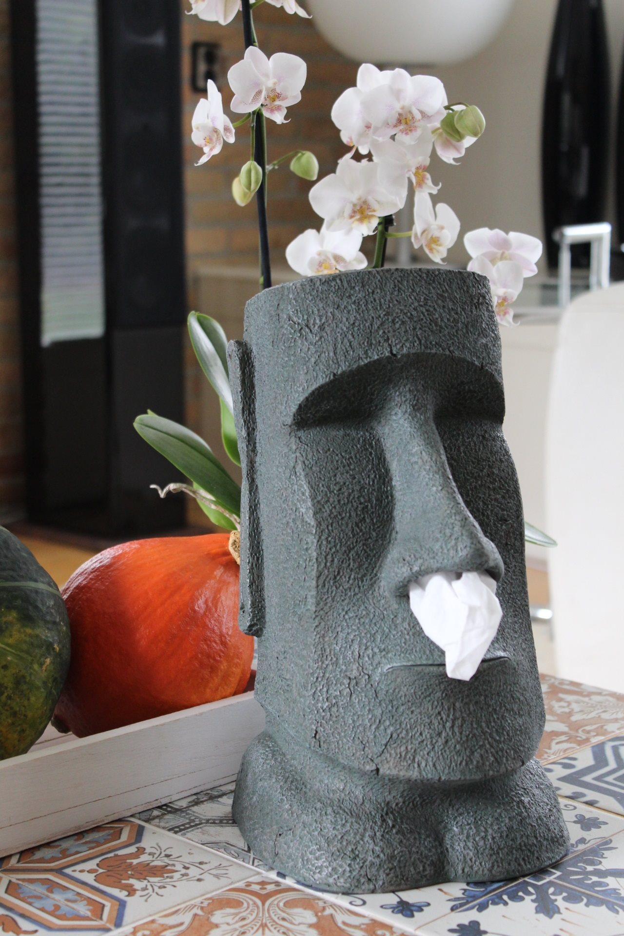 Pääsiäissaarten Moai patsas paperiteline. Aseta paperipakkaus taakse ja vedä paperi Moain nenästä. Sopii esim kylpyhuoneesen tai keittiöön. Tehty kestävästä polyresiinistä. Koko 31,5x18x19cm.
