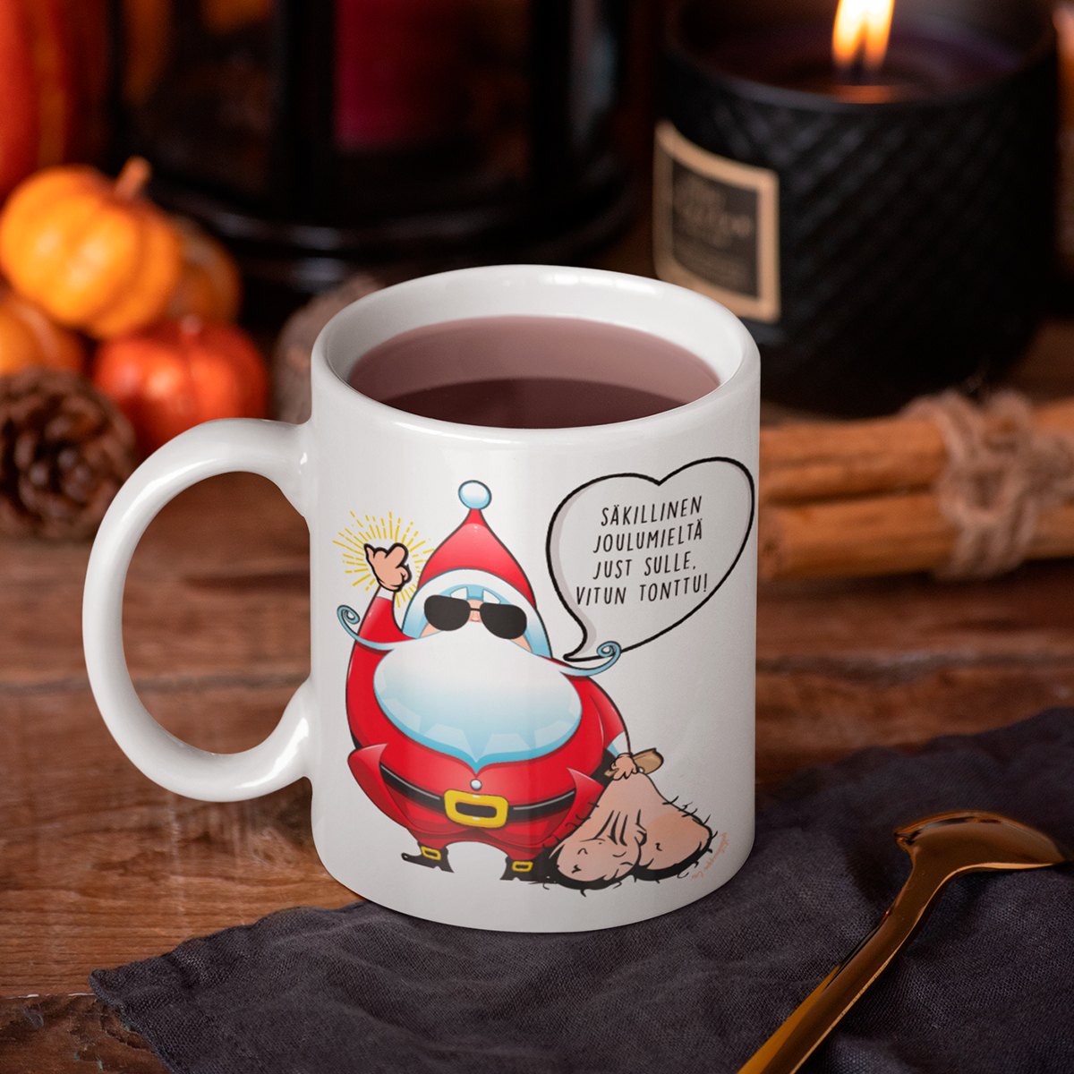 Anna läheisellesi joulumieltä! Tässä mukissa seikkailee ihastuttava pukki säkkeineen.
