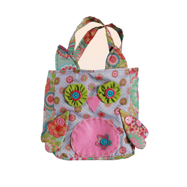 Hauska kankainen pöllökassi, nappisilmillä, korvilla ja värillisillä kuviolla. Koko 18 x 20cm