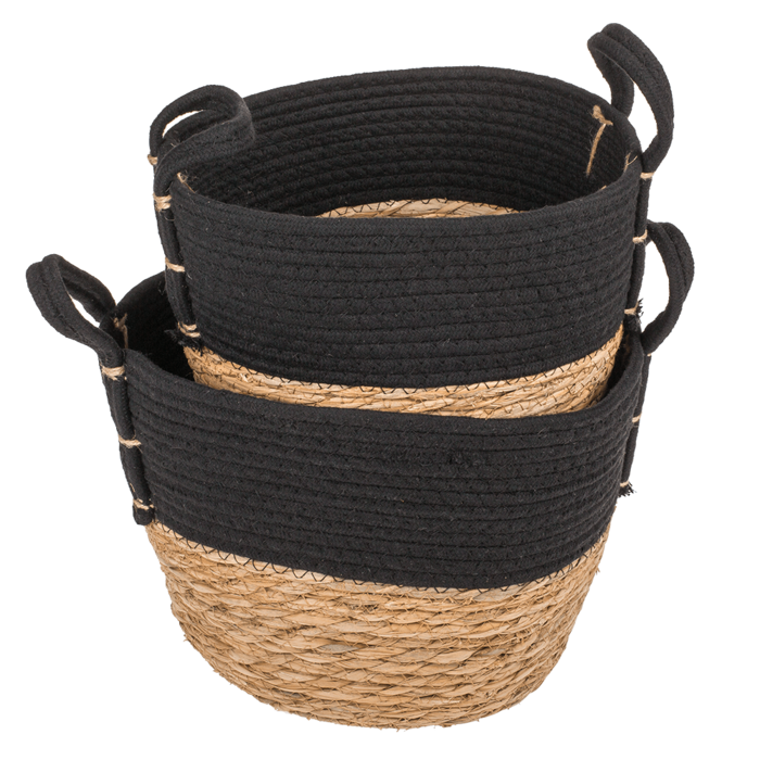 2kpl säilytyskoreja. Ruskea-mustat väritykseltään. Valmistettu puuvillasta sekä meriruohosta. Pienempi kori n. 18cm x 25cm, isompi kori n. 20cm x 30cm.