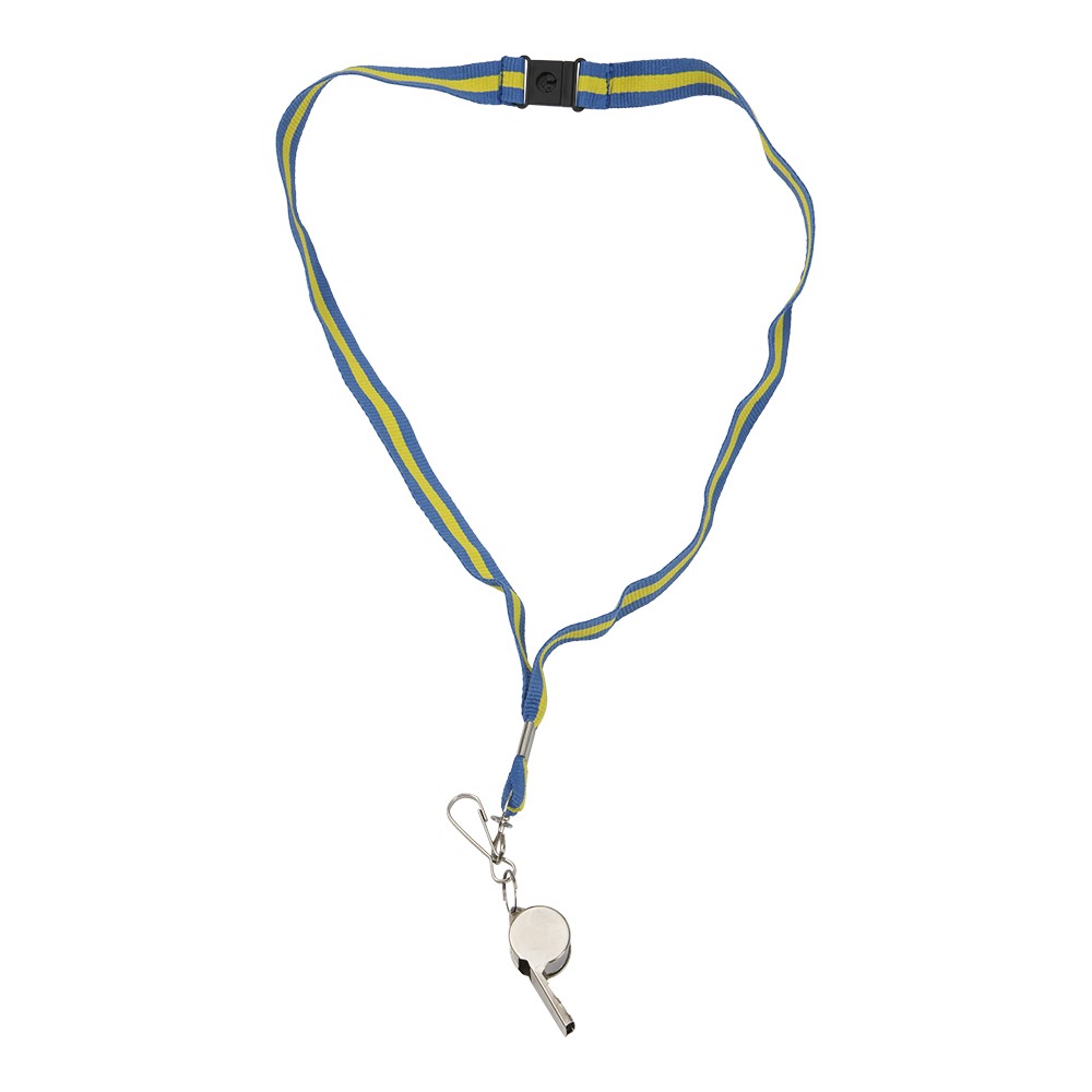 Metallinen tuomarin pilli. Sini-keltainen nauha jossa pikalukko kiinnitys.