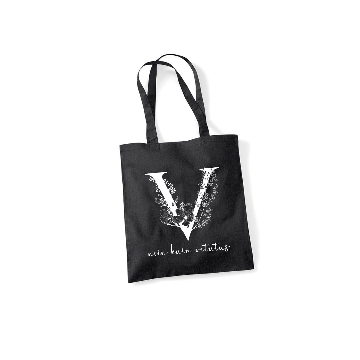V niin kuin vitutus, kuis muuten. Musta kangaskassi ihanalla valkoisella painatuksella.