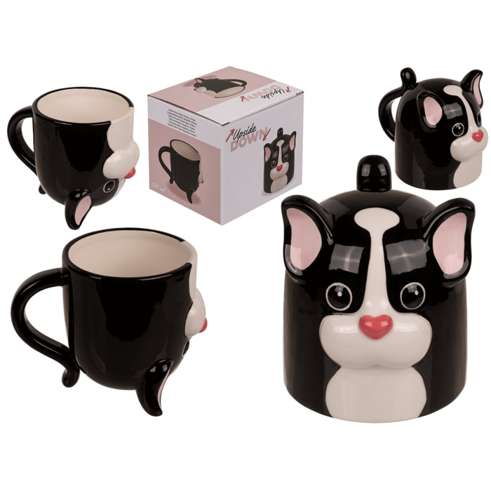 Söpö keraaminen koira muki. Säilytä ylös alaisin jolloin koira näkyy oikeinpäin, kun käytössä kupin "jalkoina" toimii korvat sekä häntä. Koko n. 12x14cm.