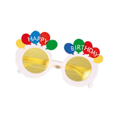 Aurinkolasit valkoiset Happy Birthday. Keltaisilla linsseillä.