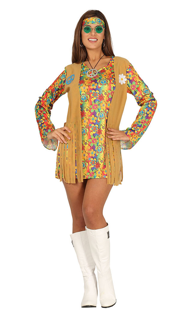 Hippitytön asu. Pukuun kuuluu pääpanta ja mekko liivillä. Koko S