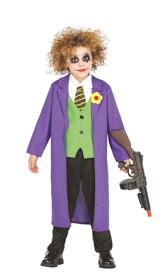Hullu Jokeri Naamiaisasu, sis. pitkän violetin sadetakin, paidan etumuksen kauluksella ja kravaatilla. Koko Ikäluokille 5-6V