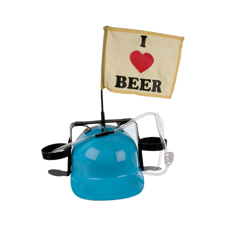 Sininen Juomakypärä, jossa paikka viirille, missä lukee I LOVE BEER (voithan toki tuunata varteen muunkin tekstin).