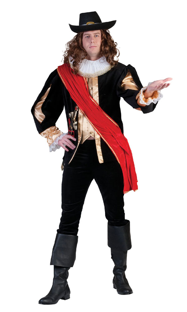 Tyylikäs vanhan-ajan kapteeni, kuningas... puku. Pukuun kuuluu takki kulllanvärisellä etumuksella,housut sekä punainen nauha. Koko:48/50.