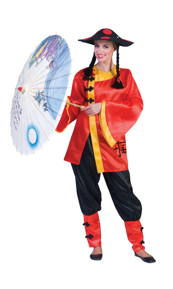 Kiinalaisen naisen puku. Pukuun kuuluu paita ja housut. Muut lisukkeet ei sisälly hintaan. Koko 40/42.