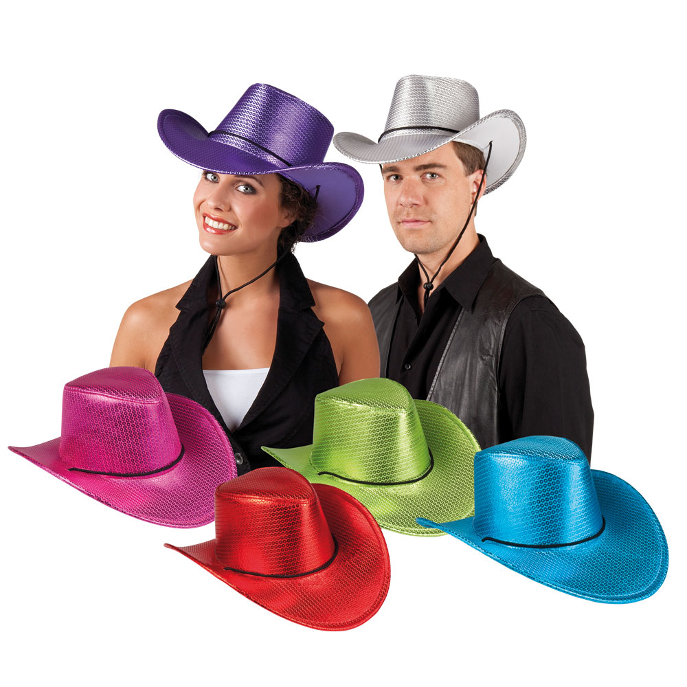 Kiiltävät lännenhatut, valittavana värit: Hopea, Pinkki, Punainen, Sininen, Vihreä ja Violetti