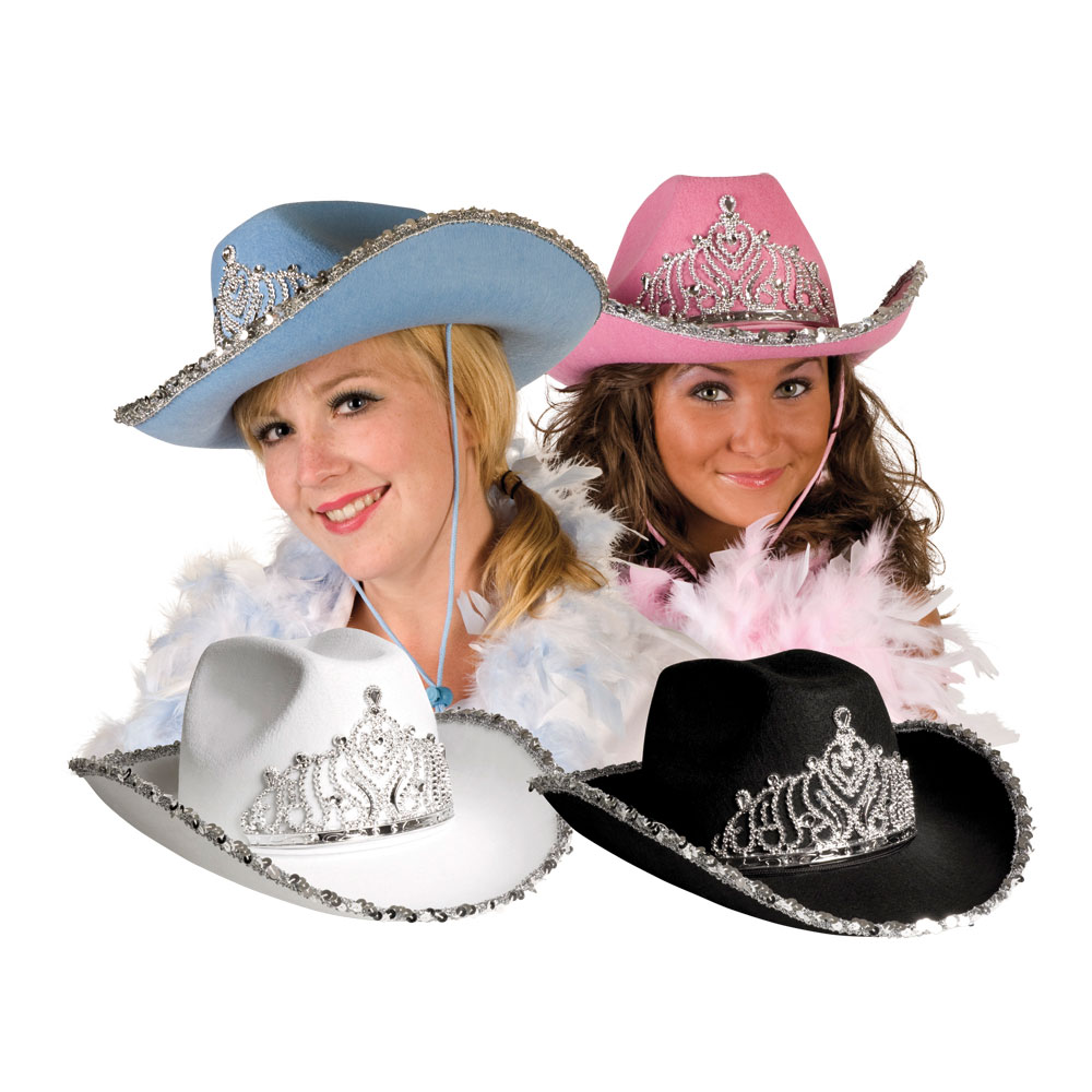 Lännenhatut tiaralla, valittavana värit: Musta, Pinkki, Sininen ja Valkoinen