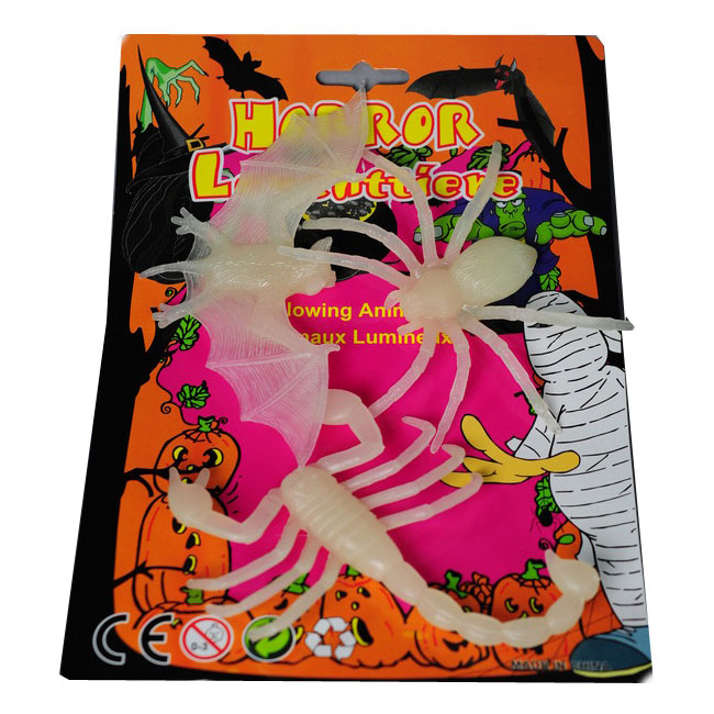 1 iso halkaisijaltaan 16cm hämähäkki, lepakko ja skorpioni. Loistavat pimeässä.