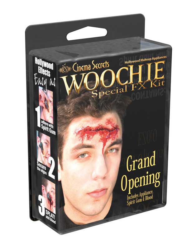 Maskeeraussetti, Woochie Grand Opening. Sisältää arven, kumi liima ampullin, ja veri ampullin. Ohjeet paketin kyljessä kuvina.