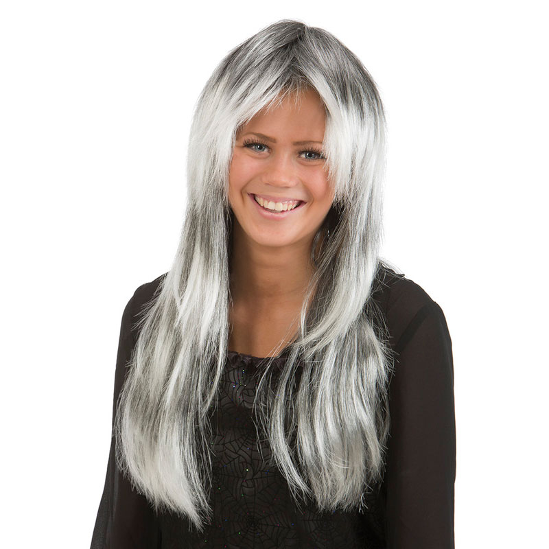 Pitkä hopea tukka, keskelläpäätä jakaus.
