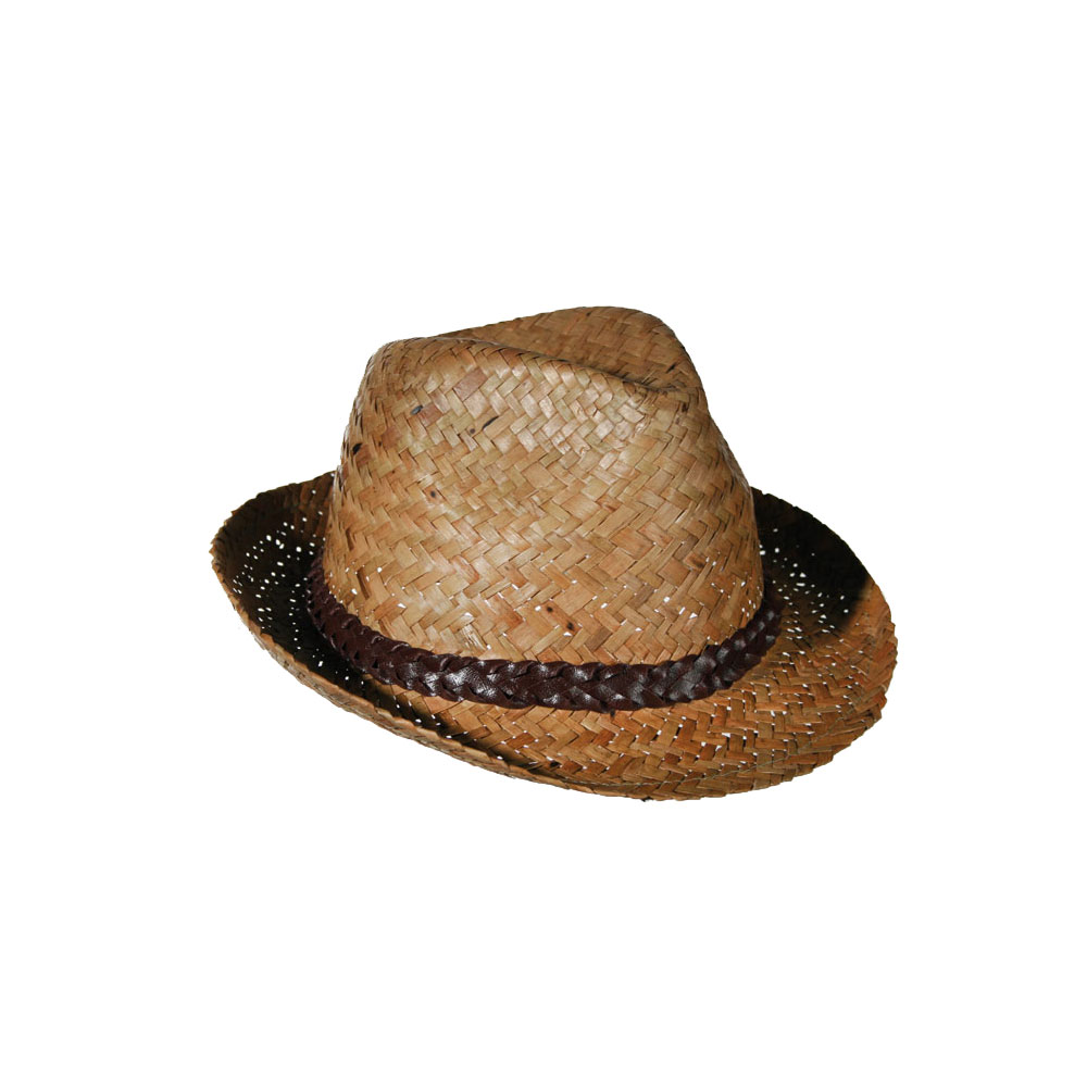 Punottu olkinen hattu nahka nauhalla.