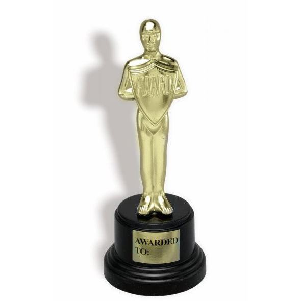 Oskar patsas. Muovia \"kultainen osa\" ja painava \"kivi\" alusta, niin kuin palkinnoissa yleensä. Paino n.390g. Korkeus n.23cm