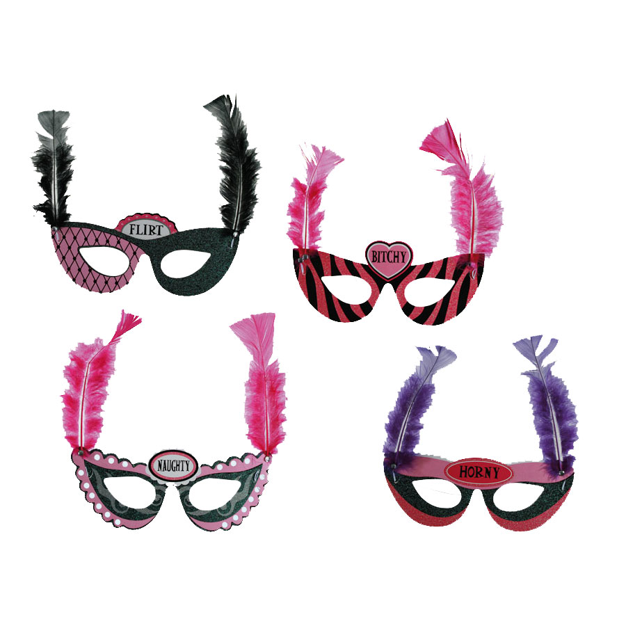 Hauska paperinen party maski sulilla. Settiin kuuluu 4 erilaisella tekstillä olevaa maskia, Bitchy, Flirt, Horny & Naughty. Ca. 21 x 20cm.
