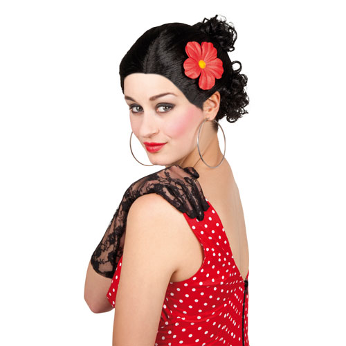 Musta kampaus peruukki punaisella kukalla.