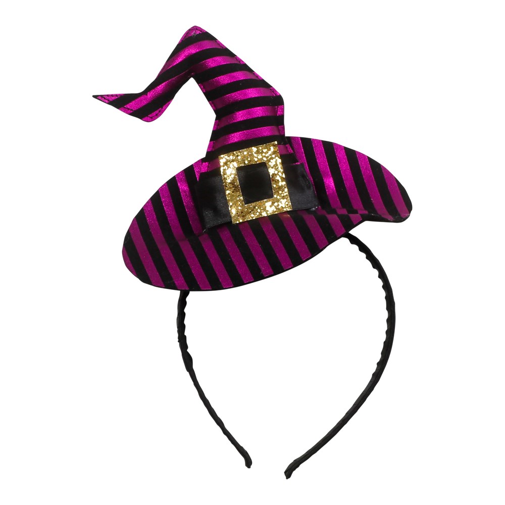 Violetti-musta raidallinen pieni noidan hattu pannalla.