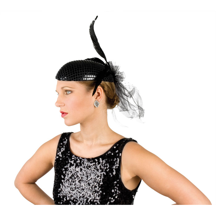 Tyylikäs musta lakki höyhenillä ja sifongilla.