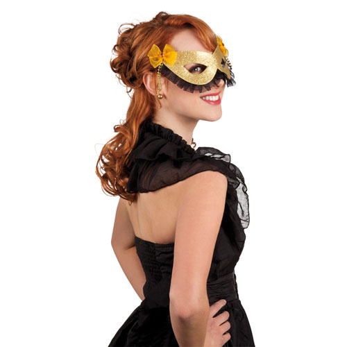 Kaunis koristeltu kullan värinen naamio ruseteilla.