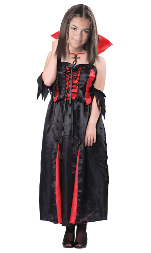 Vampyyri tytön asu ikäluokille: 4-6V (110-116m) , 7-9V (122-134cm) , 10-12V (134-140cm), 13-14V (146-152cm) ja 15V+ (158-164cm)