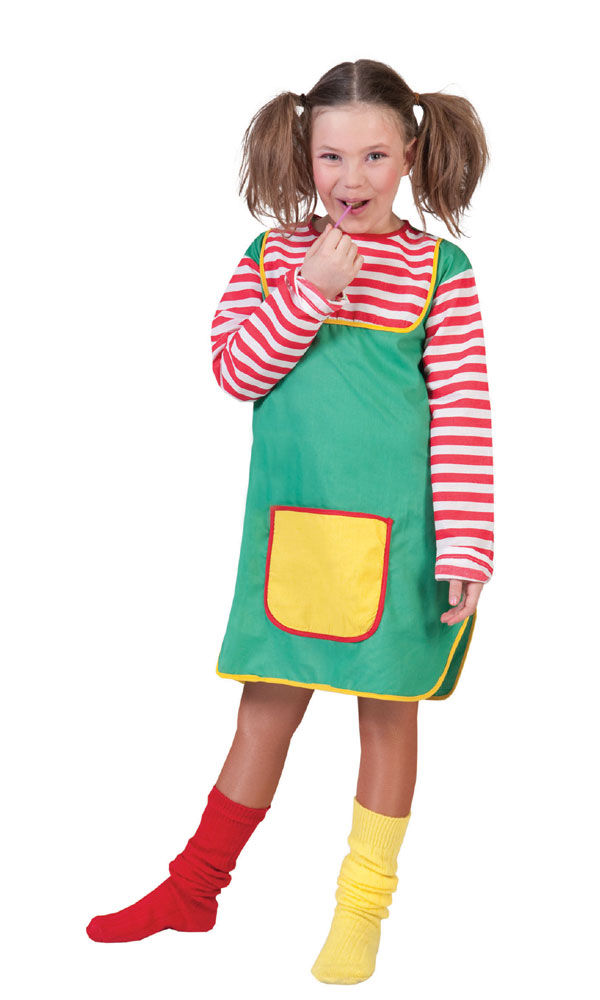 Lettipään asu, koko 164cm, ei joustavaa kangasta. Sis. mekon / paidan, eli paita ja essu ovat kiinni toisissaan. Huom! Huom! Tässä koossa mekon vihreä väri on kirkkaan neonvihreä.