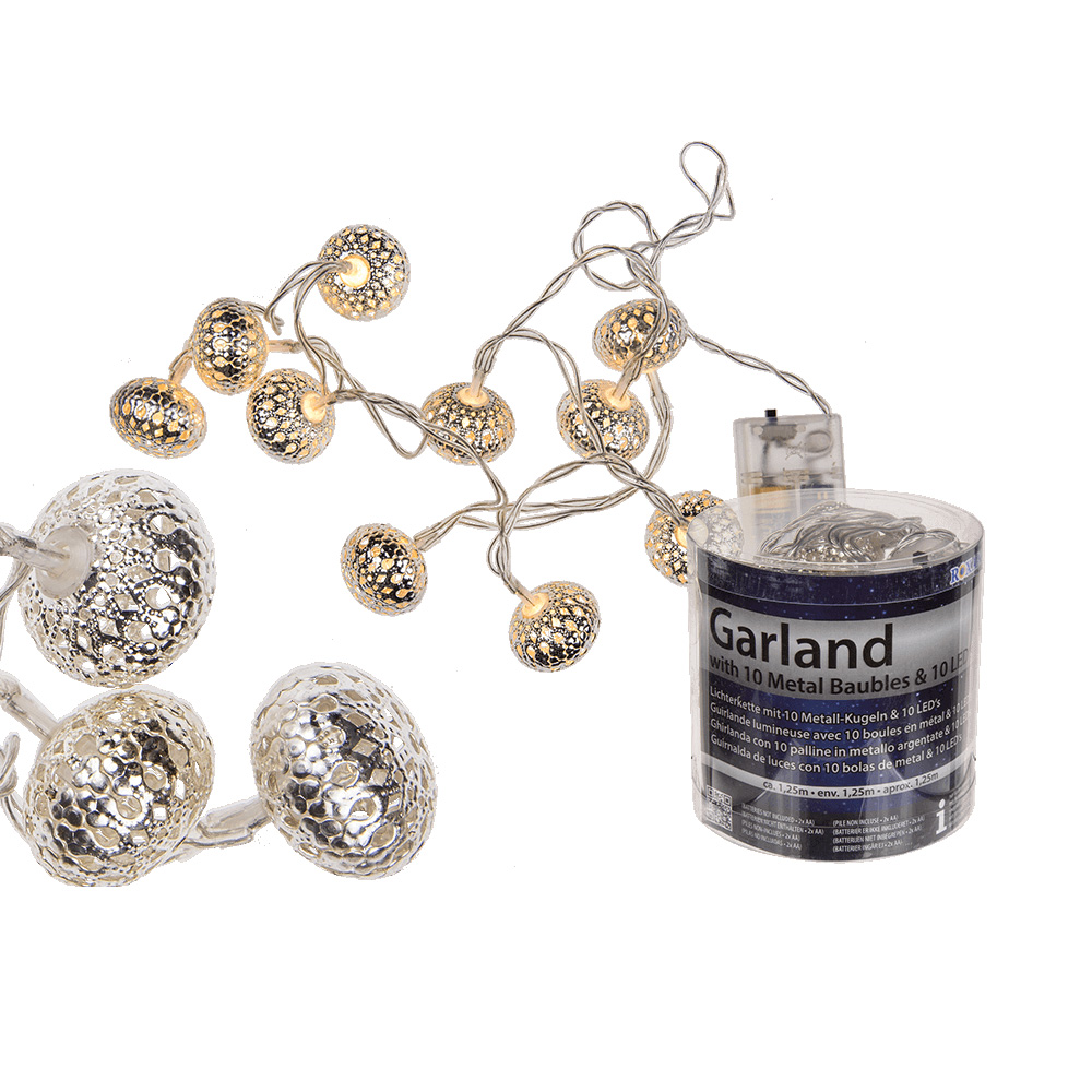 N.1,25m pitkä lämminvalkoinen pallovaloköynnös. Metallia. ca.2cm. Toimii kahdella AA-patterilla. Ihanat esim.lyhdyssäkin.
