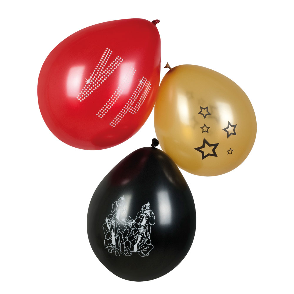VIP setti sisältää 6 ilmapalloa, 2 punaista VIP tekstillä, 2 kullan ruskeaa tähdillä ja 2 mustaa ihmiset kuvaa kuvalla.
