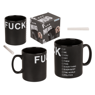 Musta kahvikuppi Fuck tekstillä. Sisältää liidun. Tilavuus n. 885ml koko 12,5x11cm
