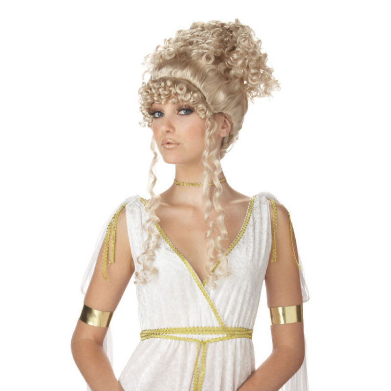 Vaalea kreikkalaisen jumalatteren peruukki, runsaasti kiharoita.