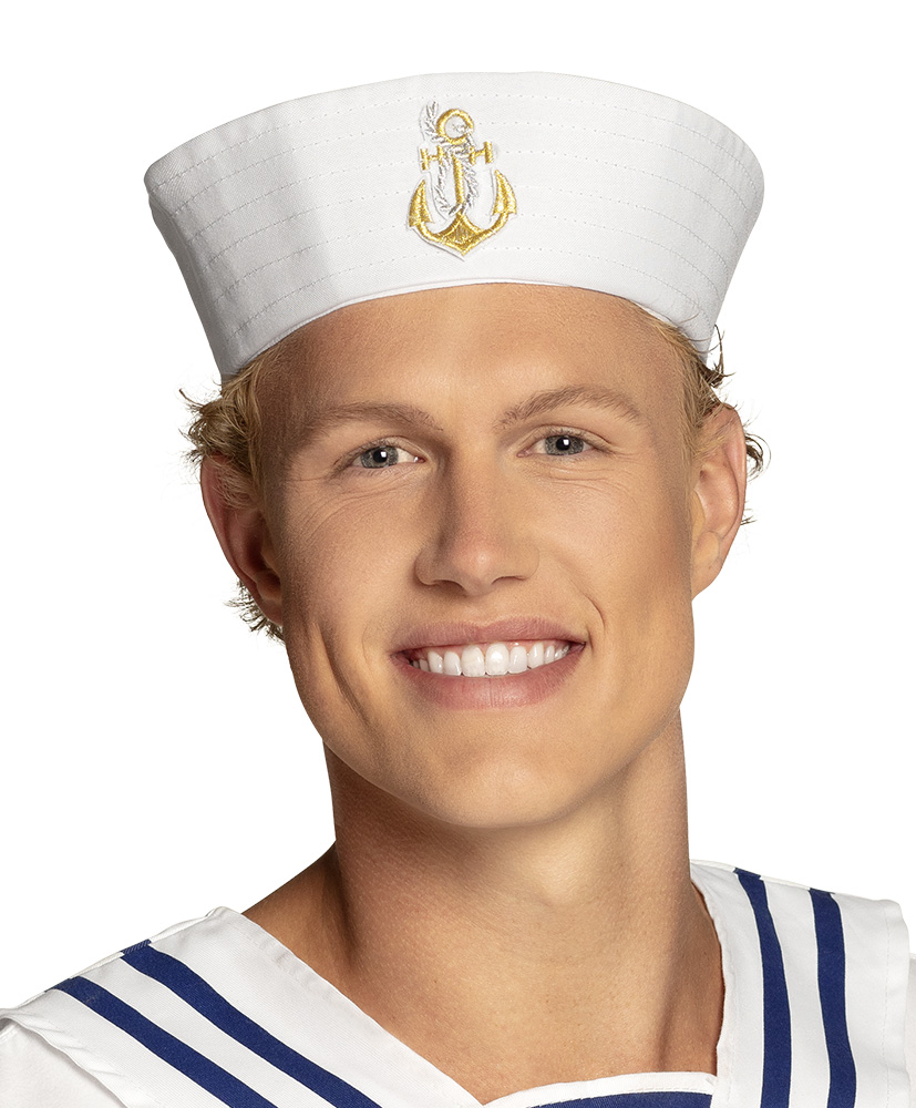 Valkoinen matruusin lakki, edessä ankkurin merkki.