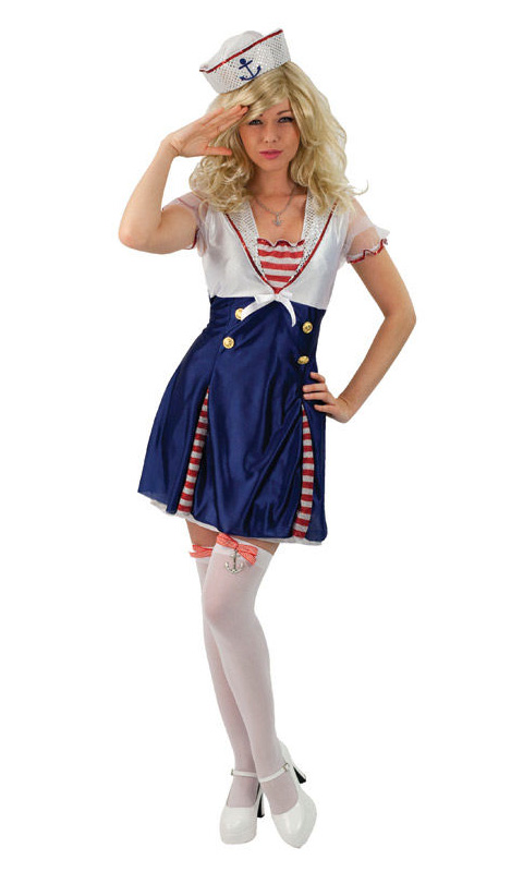 Merimiestytön pukuun kuuluu mekko ja lakki. Koko L