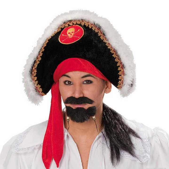 Pehmyttä materiaalia oleva musta pohjainen merirosvolakki hiuksilla.