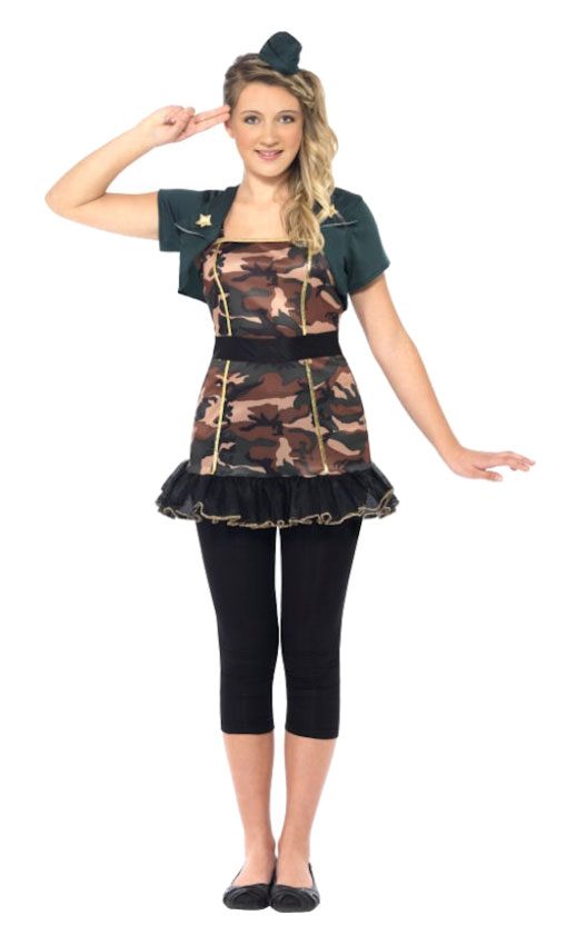 Miss Armeija puku koko XS/32-34. Puku sisältää mekon, hatun ja jakun. Rinnanympärys 83-85cm, vyötärö 62-65cm ja lantio 89-91cm.