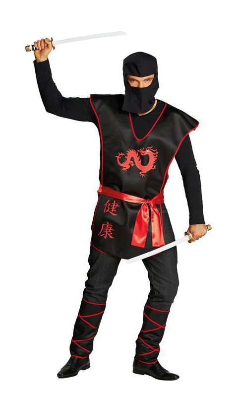 Musta/Punainen miesten Ninja puku. Pukuun kuuluu punainen vyö, liivimallinen tunika (ei hihoja), säärisuojat punaisella koriste nyörityksellä sekä huppu.