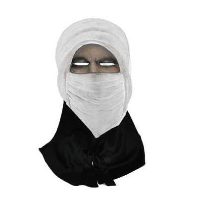 Valkoisella kasvo osalla oleva ninja maski, huppu musta